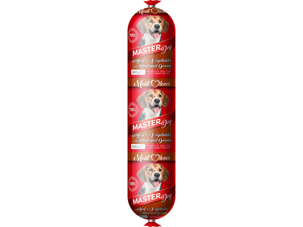 Zloženie: Mäso a vedľajšie produkty živočíšneho pôvodu 70% (hovädzina 4%), mrkva (4%), obilniny, rastlinné vedlajšie produkty, minerálne látky.